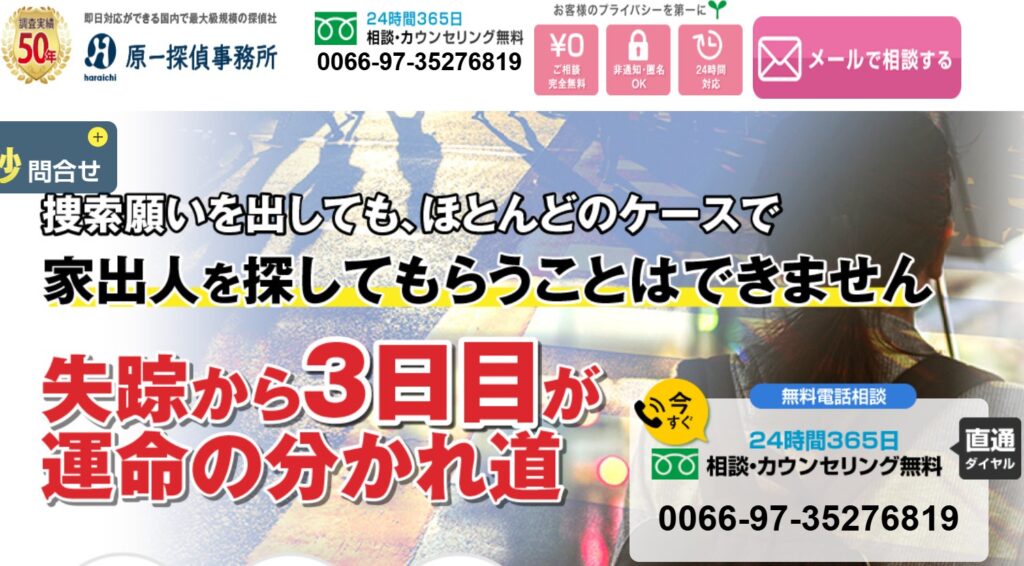 | 原一探偵事務所(福岡) | 大規模ネットワーク/報告書品質が高い | 家出・所在確認・旧友探し | 要見積(パック/時間制) | ◯ | 案件次第 | 相談する |